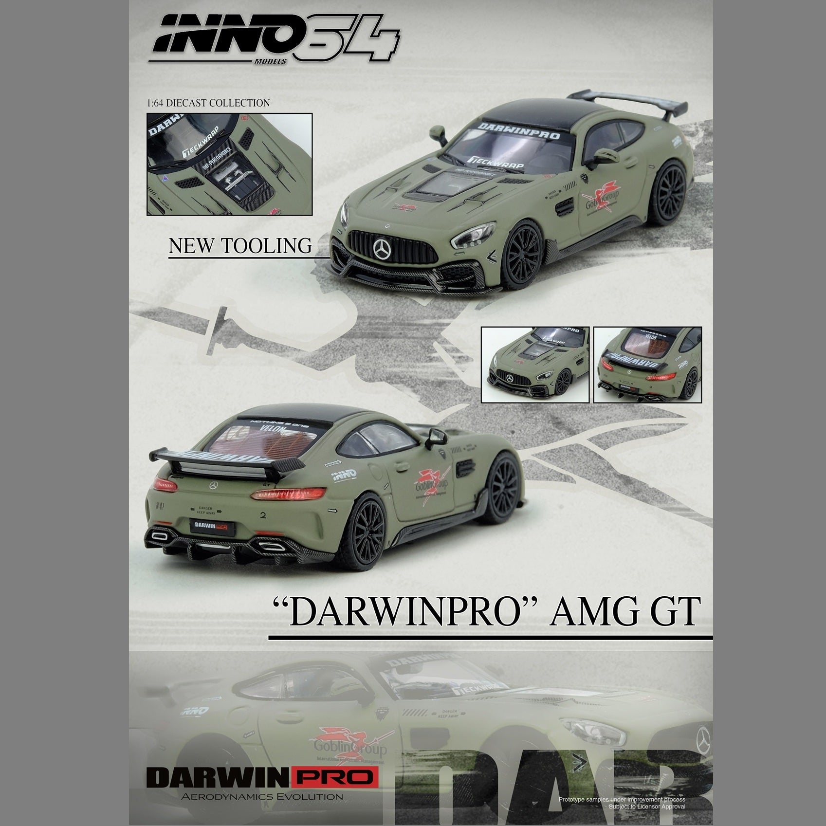 - 1:64 scale diecast model by Inno64 featuring the Mercedes AMG GT Darwin Pro edition (SKU: IN64-AMGGT-DP01)