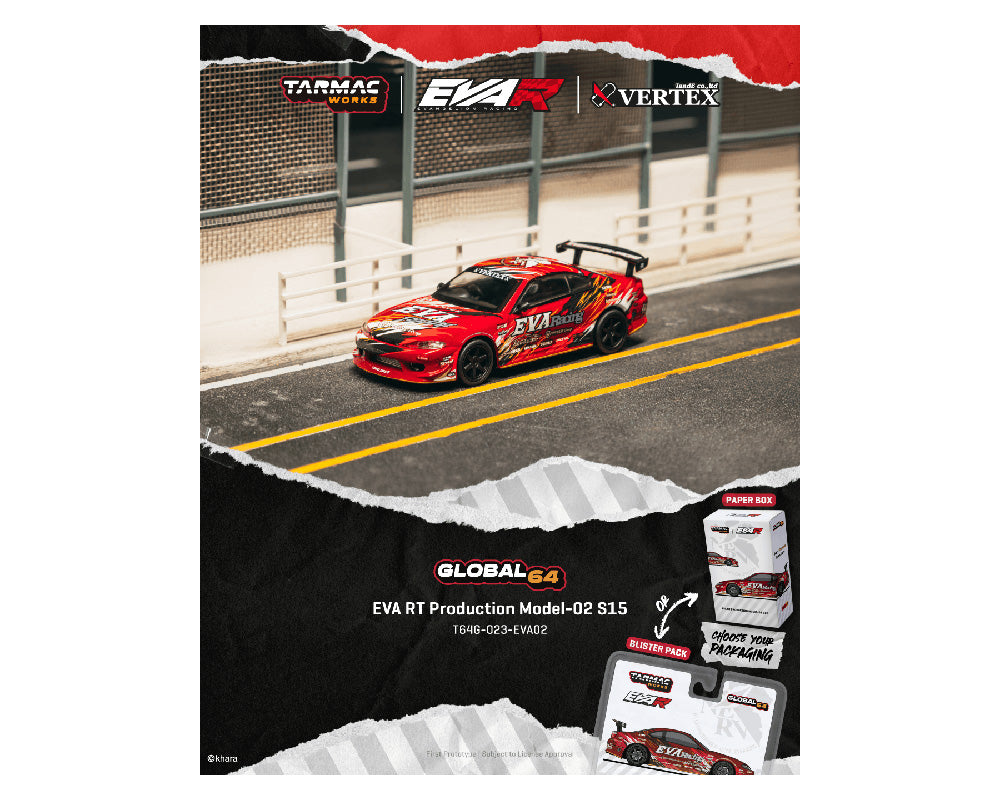 - 1:64 scale Tarmac Works model featuring the EVA RT Production Model-02 Nissan S15 with authentic Vertex body modifications and Global64 exclusive status