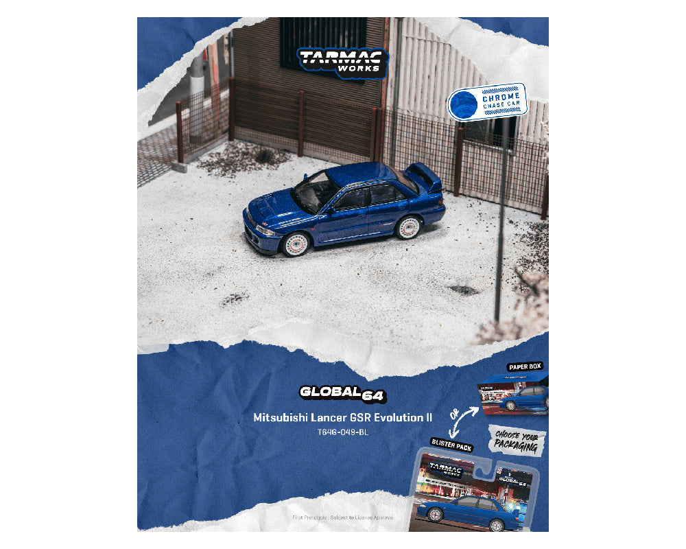 - 1:64 scale Tarmac Works Global64 edition featuring the Mitsubishi Lancer GSR Evolution II with authentic proportions and stance