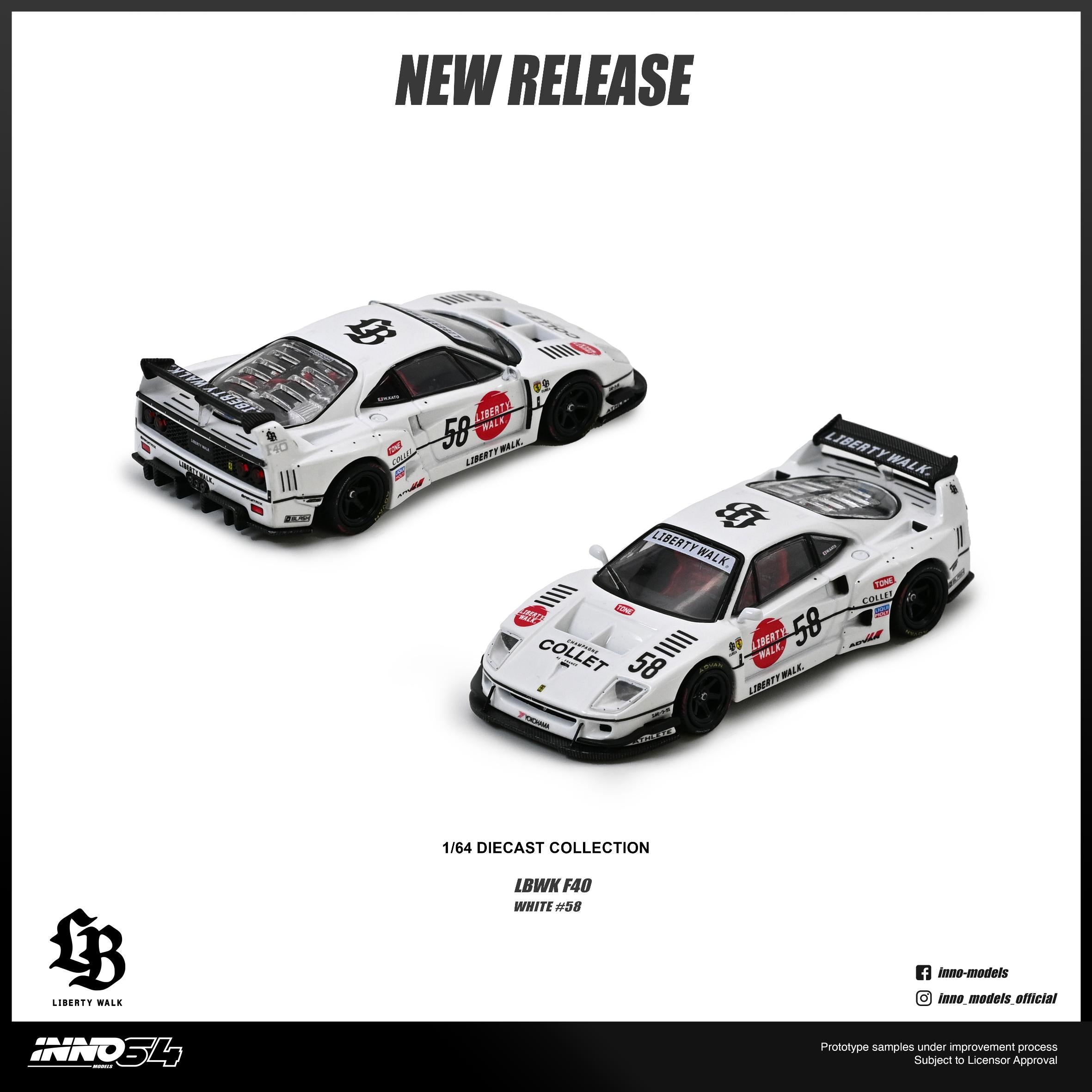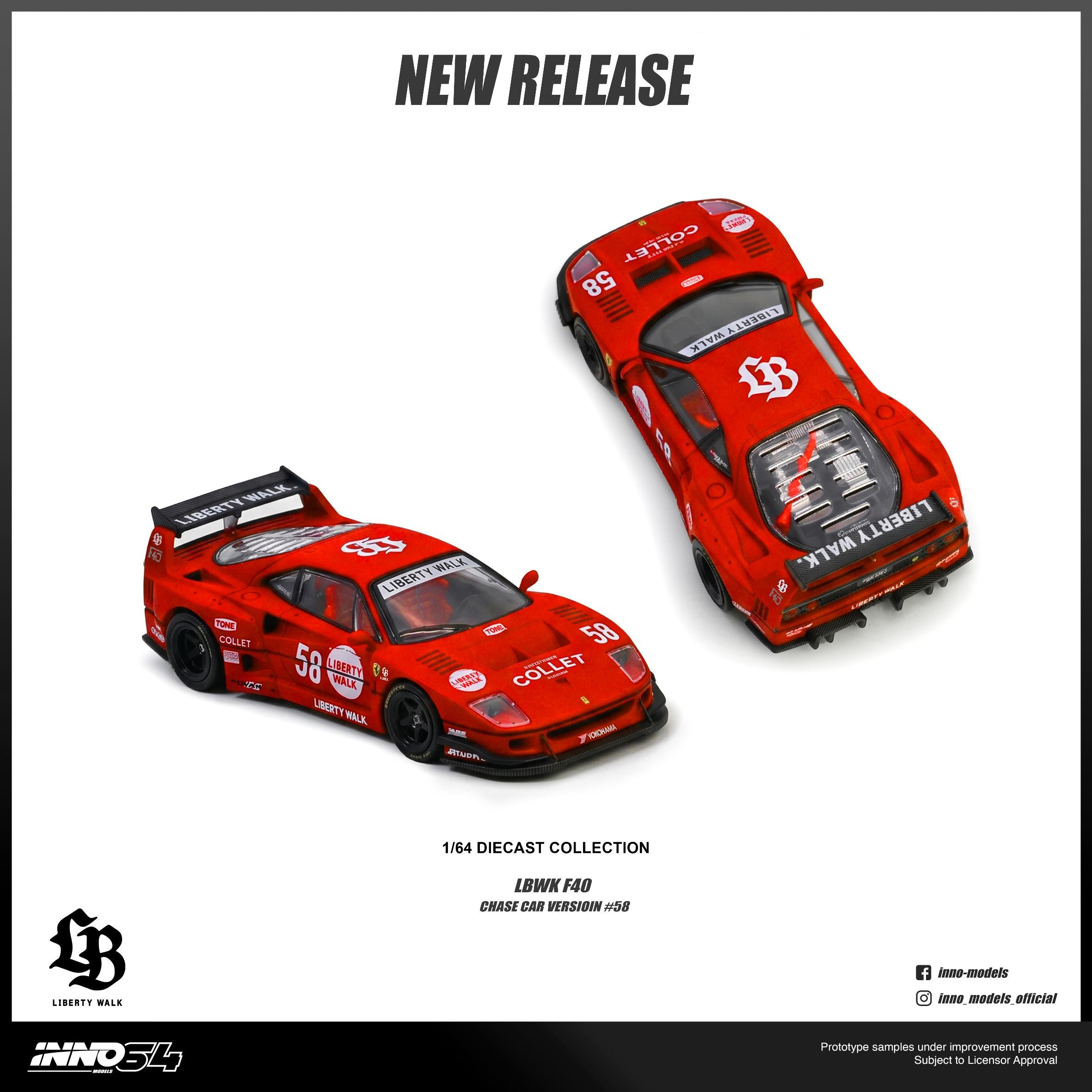- 1:64 scale Inno64 diecast model featuring the Ferrari F40 in Liberty Walk LBWK Collet specification